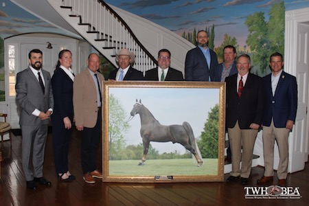 The official World Grand Champion portrait, by photographer Shane Shiflet, commemorates Cavender's first World Grand Championship win. It was unveiled in December at the TWHBEA Awards Banquet and is displayed at Ellington Center, home of the Tennessee Department of Agriculture. On hand for the presentation of the portrait were (pictured from left to right) Warren Wells, TWHNC CEO, Amanda Wright, TWHBEA Executive Committee President, Commissioner Hatcher, Andy Holt, Deputy Commissioner, Mark Farrar, TWHBEA CEO, Tim Smith, trainer and rider of the champion, Knox Blackburn, owner of EquiKnox Farm, Bruce MacDonald, owner of Cavender with wife, Robin (not pictured), and Jeffrey Howard, Chairman of the TWHNC Board.