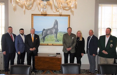 The official World Grand Champion portrait, by photographer Shane Shiflet, was unveiled in December at the TWHBEA Awards Banquet and is displayed at Ellington Center, home of the Tennessee Department of Agriculture. On hand for the presentation of the portrait were (pictured from left to right) Mark Farrar, TWHBEA executive director, Warren Wells, Celebration CEO, Jack Heffington, TWHBEA president, Dr. Jim and Lisa Baum, owners of Justified Honors, Commissioner Hatcher, and John Allen Callaway, the trainer and rider of the champion.