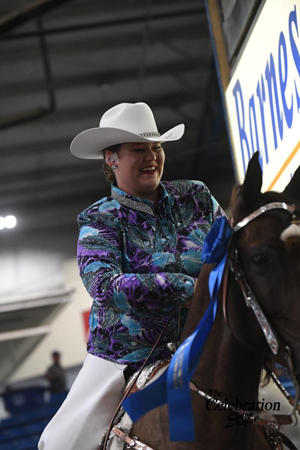 Stuart was the winning instructor in the next equitation class, for riders 12-14, as well and she greeted Brooklyn Fuss in the winner’s circle ahead of reserve world champions Jayden Jackson. The final equitation class featured the older riders judged on their form and showmanship and Claire Hankins put together a winning package while Alexandra Oddo put forth a good effort for reserve.