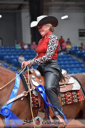 Scarlett O’Hara LLC and owner-rider Frank Clark from Athens, Alabama, walked into the winner’s circle in the Owner-Amateur Youth 12-17 Western Country Pleasure class. They were the unanimous selection of the judges in the nine entry class. This win was added to their three blues and two reserves in five classes earlier this show season. Riding to a second place streamer were Shameless SF and co-owner Abi Smith for co-owner Janet Howell. It’s A Knight To Remember and co-owner-rider Alex Luttrell were third for co-owners Lisa and Jeff Fisher.